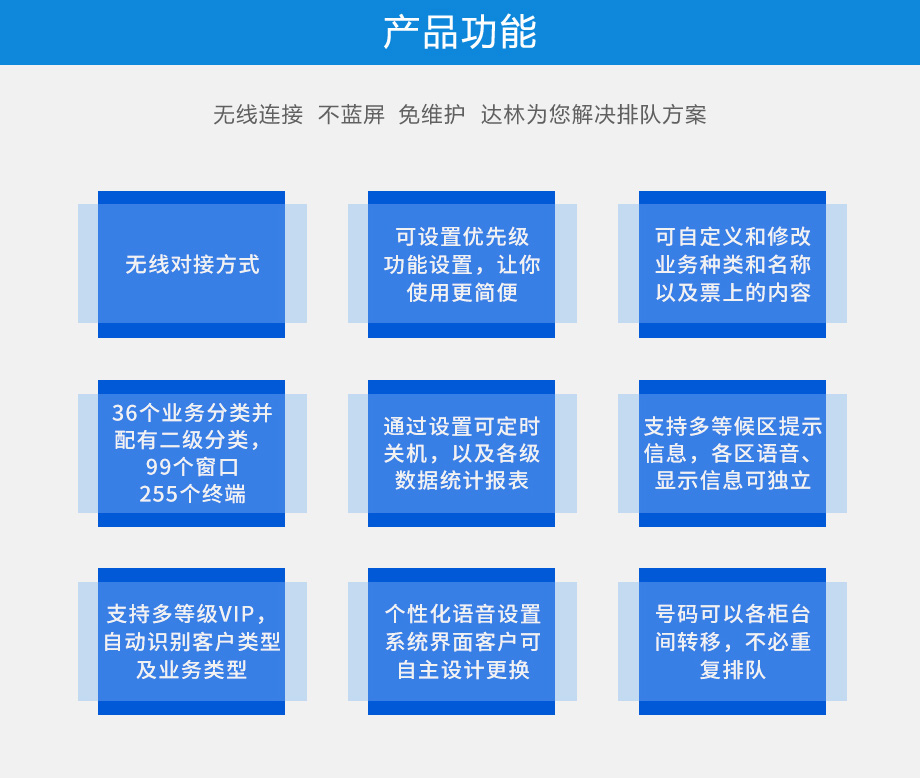 | 排隊機柜 | 采用一級冷軋鋼,外表面進口汽車金屬烤漆,流線型、人性化設計,防磁,防靜電,防銹 | |